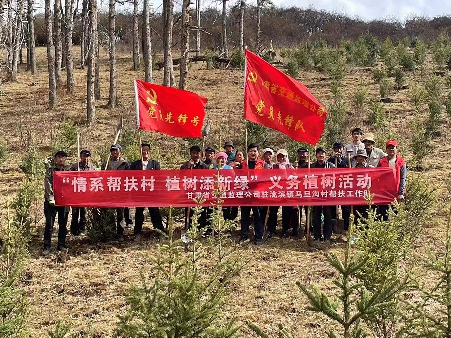 为积极响应习近平总书记“全社会都做生态文明建设的实践者、推动者,让祖国天更蓝、山更绿、水更清、生态环境更美好”的号召,以打造“五无甘南”,创建“十有家园”为目标,加快推进乡村振兴战略实施,共建生态宜居宜业的美丽乡村,近日,甘肃省交通工程建设监理有限公司驻临潭县洮滨镇马旦沟村帮扶工作队积极发挥自身职能,协同包村干部、村“两委”成员、驻村党员、义务志愿者及群众代表等开展义务植树活动。
